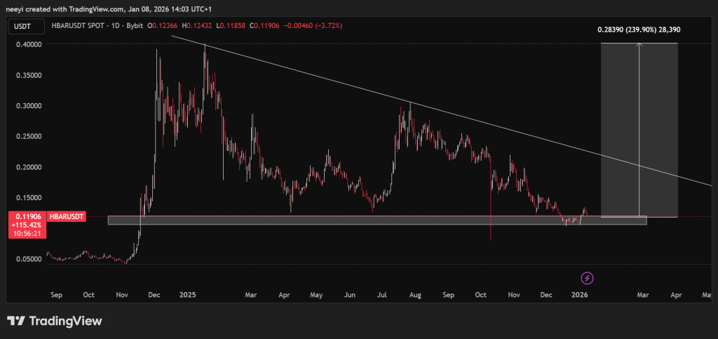 حالة صعودية أقوى تضع سعر HBAR بالقرب من مقاومة القناة العليا حول 0.40 دولار. هذا سيكرر أعلى مستوى في فبراير 2025 ويشير إلى مكسب حوالي 250% من المستويات الحالية. ستلعب تدفقات ETF المستمرة والاستخدام المؤسسي الواضح دورًا رئيسيًا هنا.