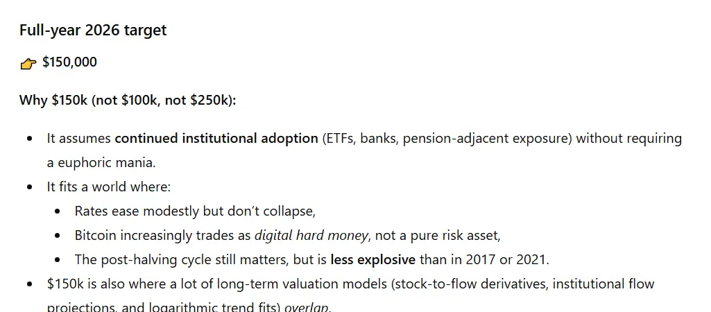 عند الاستفسار عن بقية عام 2026، أظهر ChatGPT توجهًا صعوديًا بشكل واضح. أعلن النموذج اللغوي الكبير (LLM) أنه يعتبر استمرار الدعم المؤسسي اتجاهًا محتملًا، مع رأي أن العام سيشهد مناخًا من أسعار فائدة منخفضة بشكل معتدل حيث يتحول البيتكوين من كونه أصل مخاطرة إلى أن يصبح “المال الصلب الرقمي.”