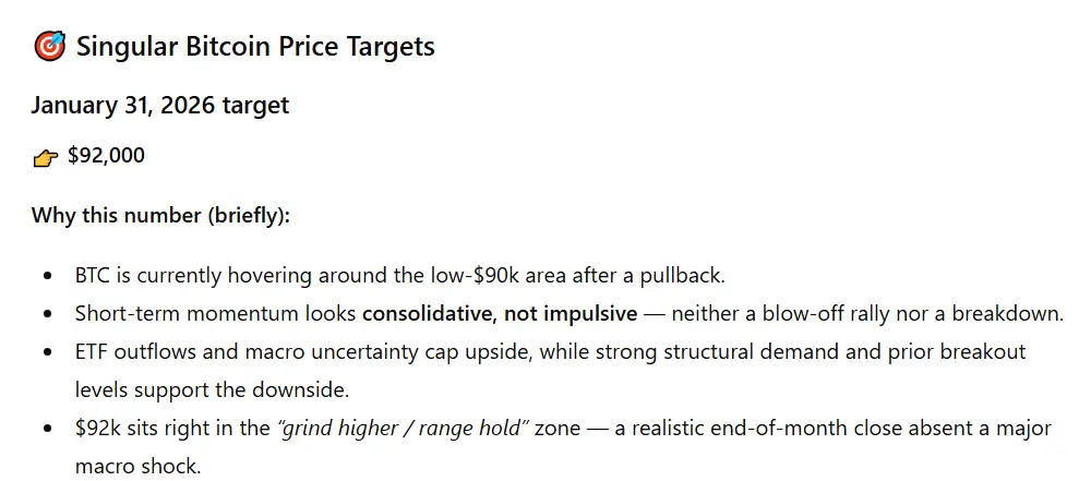 على الرغم من العديد من المحفزات المحتملة، قدم نموذج الذكاء الاصطناعي هدف سعر متحفظًا قليلاً ومائلًا نحو الصعود لبيتكوين في 31 يناير. تحديدًا، قدر ChatGPT أن العملة المشفرة من المحتمل أن ترتفع وتتداول عند 92,000 دولار بنهاية الشهر.