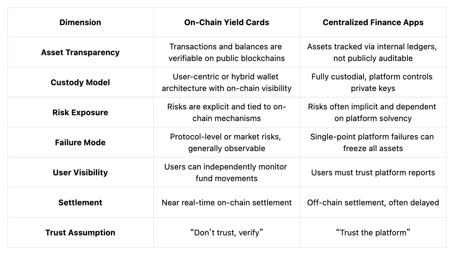 يُقارن الجدول التالي بين منطق الأمان بين بطاقات العائد على السلسلة وتطبيقات التمويل المركزي من حيث الرؤية للمستخدم، وضع الحفظ، وطرق التعرض للمخاطر: