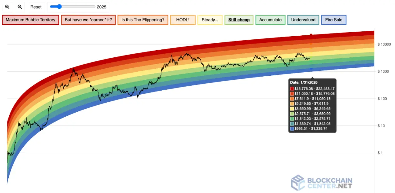 El modelo de valoración a largo plazo de (ETH) de Ethereum, el Rainbow Chart, apunta a un rango de precios amplio pero estructurado para el 31 de enero de 2026, basado en su curva de crecimiento histórico y bandas de tendencia logarítmica.