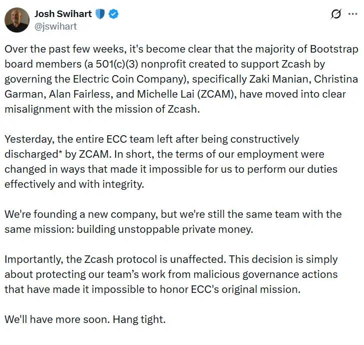 Pengembang Zcash berpisah dari Electric Coin Company, berencana untuk membuat perusahaan baru