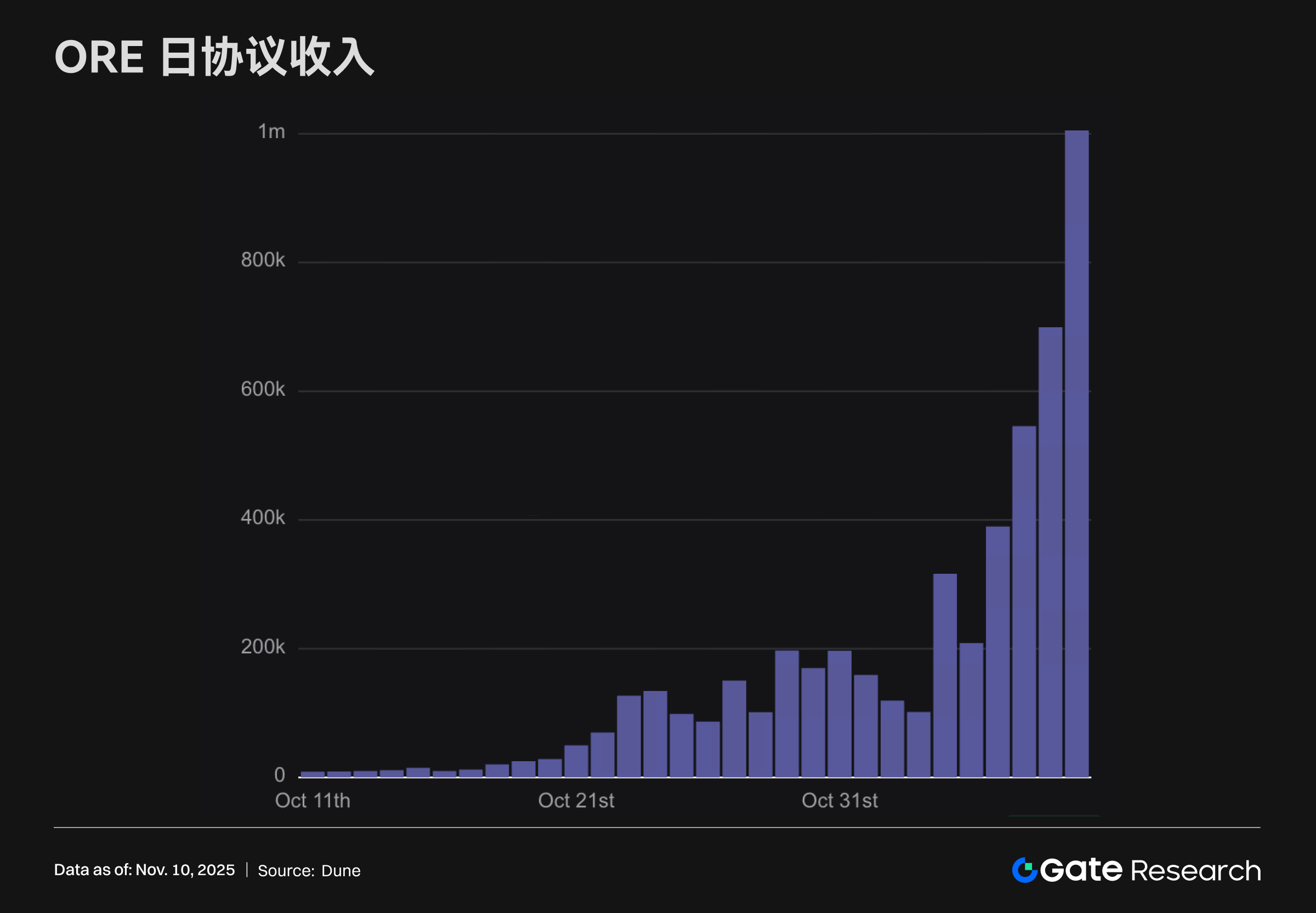 SolanaエコシステムのマイニングプロトコルOREは、11月9日に1日の収入が100万ドルを突破し、歴史的な新記録を樹立しました。新しいV2マイニングプロトコルを導入して以来、OREは市場の注目を再び集め、トークン価格とプロトコルの収入が同時に上昇しました。新しいプロトコルは5×5のグリッドマイニングシステムを採用しており、各ラウンドは1分間続き、マイナーはSOLをステークしてブロックを競います。未当選のブロックのSOLは勝者に再分配され、勝者は追加のORE報酬を獲得する機会もあります。さらに、V2で導入されたMotherlodeプールメカニズムはランダムなインセンティブを提供し、ゲーム性と参加度をさらに高めています。データによれば、10月中旬以前はOREプロトコルの日収入は数千ドルの水準を維持しており、最低時は約548ドルでした。10月22日以降、プロトコルの収入は爆発的な成長を遂げ、わずか10日余りで10万ドルのレベルに跳ね上がり、最終的には11月に100万ドルの大台を突破しました。