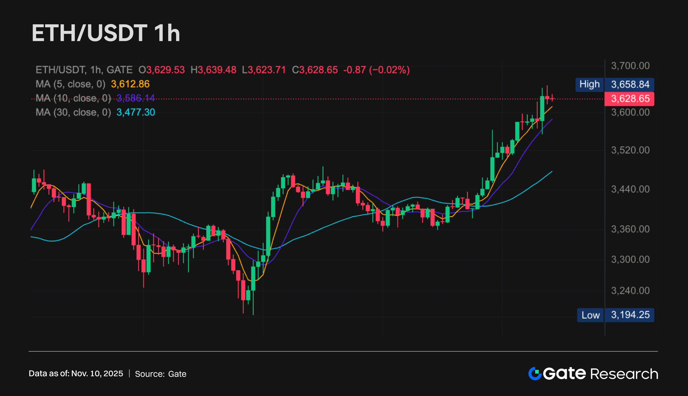 動向構造から見ると、ETHは3,480ドル付近でサポートを受けた後、新たな上昇モメンタムを開始し、一時的に段階的な高値である3,658ドルに達しました。短期的には高値で小幅な調整が見られ、これは健康的なテクニカル整理に該当します。もし価格が3,600ドル以上で安定して振動し、移動平均線のサポートが破られなければ、今後は3,680–3,700ドルの抵抗ゾーンを再度テストする可能性があります。もし3,580ドルを下回ると、3,520ドルでサポートを求める可能性があります。
