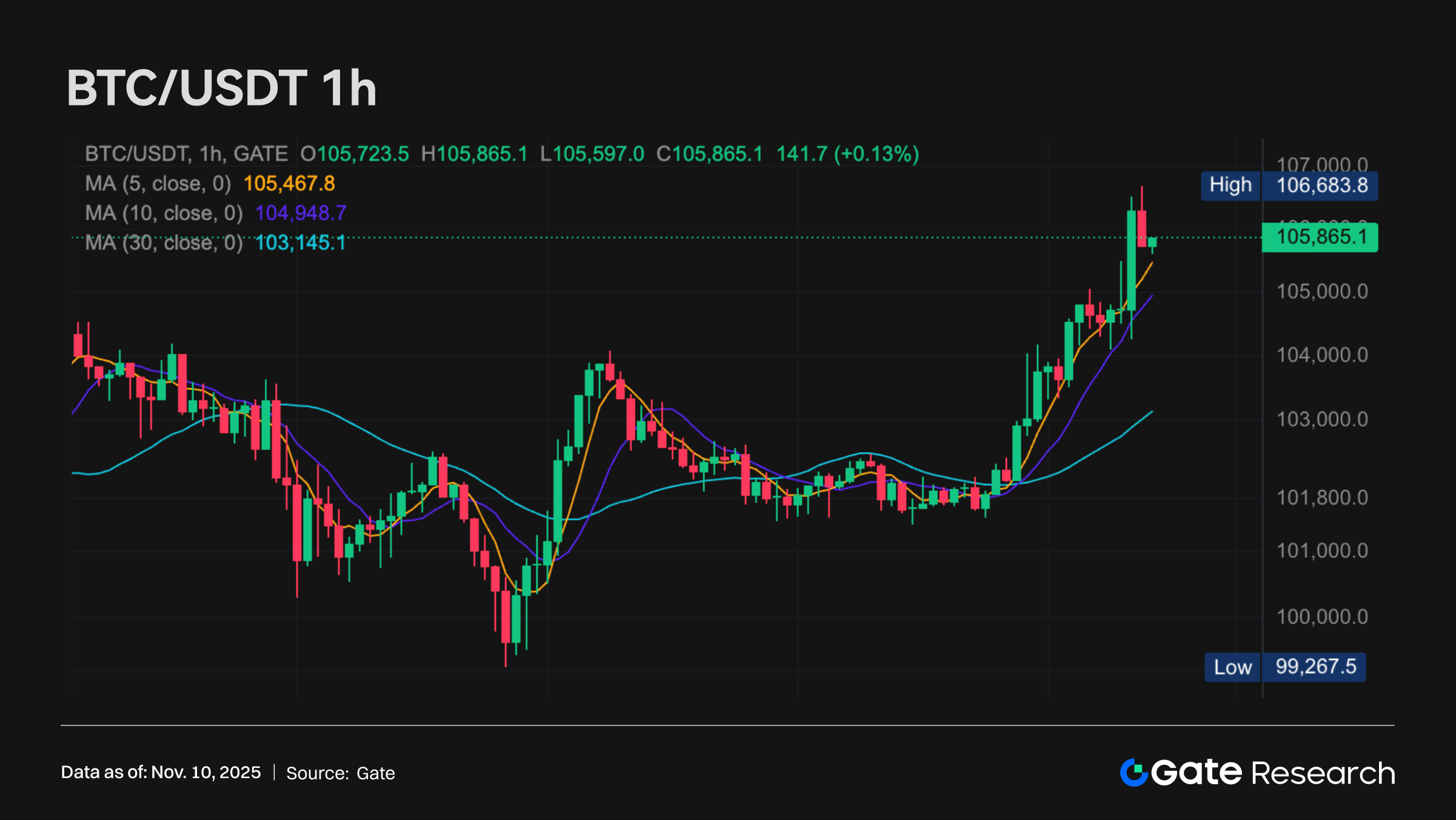 形状から見ると、BTCは103,000ドル付近で安定した後、急速に上昇し、一時106,683ドルの段階的な高値に達しました。その後、高値でわずかに調整が見られ、上方に短期的な利益確定の圧力が存在することを示しています。価格が105,000ドル以上で安定して整理し、移動平均線のサポートを維持できれば、前の高値範囲106,500–107,000ドルをテストするためにさらに上昇する可能性があります。逆に、105,000ドルのサポートを下回ると、104,000ドル付近で新たな買い支えを求めるために戻る可能性があります。