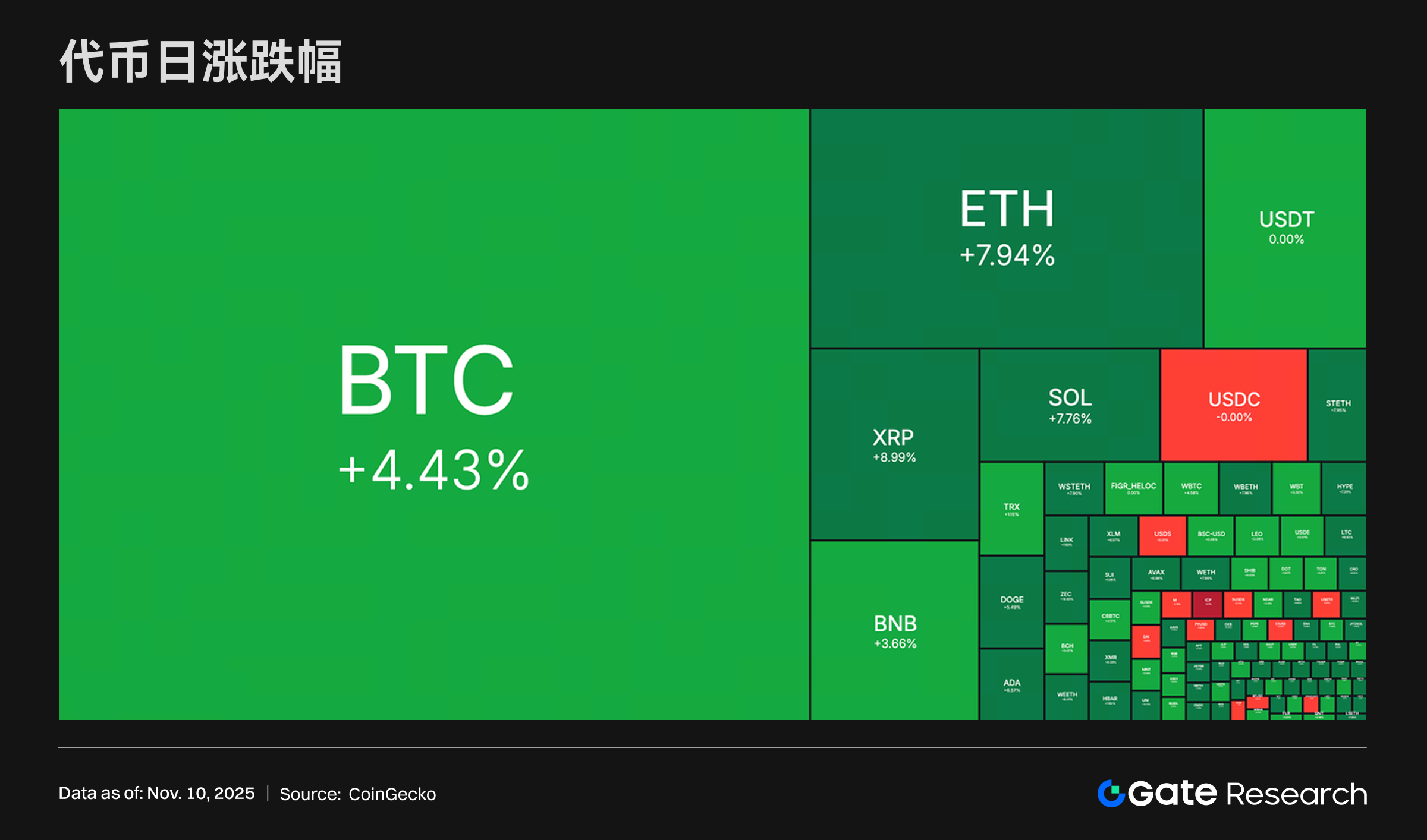過去24時間、暗号化市場は強気の反発を見せ、全体的な感情が著しく回復しました。BTCは4.43%上昇し、市場に安定した上昇基調を築きました;ETHは7.94%の上昇率で主要資産の中で先頭を切り、資金がリスク資産セクターに戻ることを促しました。主要なアルトコインの中では、Solana(+7.76%)が強い勢いを維持し、XRPは8.99%の上昇率で際立ったパフォーマンスを見せました。