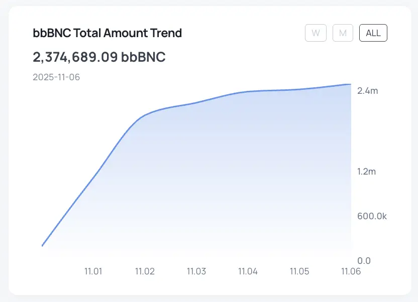 527万BNCがbbBNCにロックされており(6.6%の総供給量)。プロトコルの収益はすでに110万BNCをバイバックを通じて獲得し、110,000 BNCが永久に焼却されました。供給は80Mから79.9Mに収縮しました。APYはロック期間に応じて**49.7%から145.1%**の範囲でした。