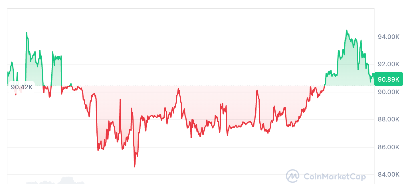 執筆時点で、ビットコインは約90,890ドルで取引されており、過去24時間で2%以上下落し、今週の高値94,400ドルから下落しています。