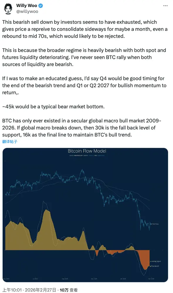 On February 27, 2026, after months of sustained volatile decline, the crypto market hovers around $67,692. On-chain analyst Willy Woo released a series of projections regarding the current market phase, sparking widespread discussion. He pointed out that the bearish sell-off led by investors is nearing its end, but the simultaneous deterioration of spot and futures liquidity makes any rebound unlikely to sustain.