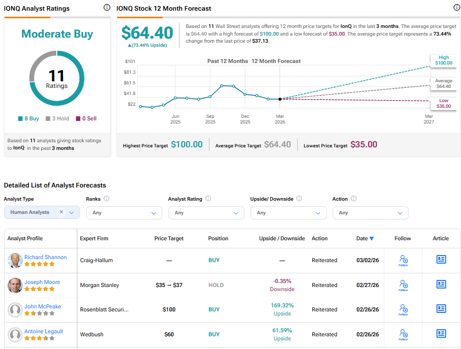 On the Street, IonQ holds a Moderate Buy consensus rating. The average IONQ stock price target stands at $64.40, implying a 73.44% upside from the current price.