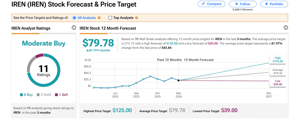 However, the average IREN price target of $79.78 implies about 82% upside from current trading levels.