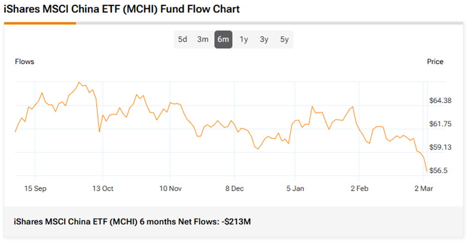 The iShares MSCI China ETF has seen the second-highest net outflows of $213 million over the past six months.