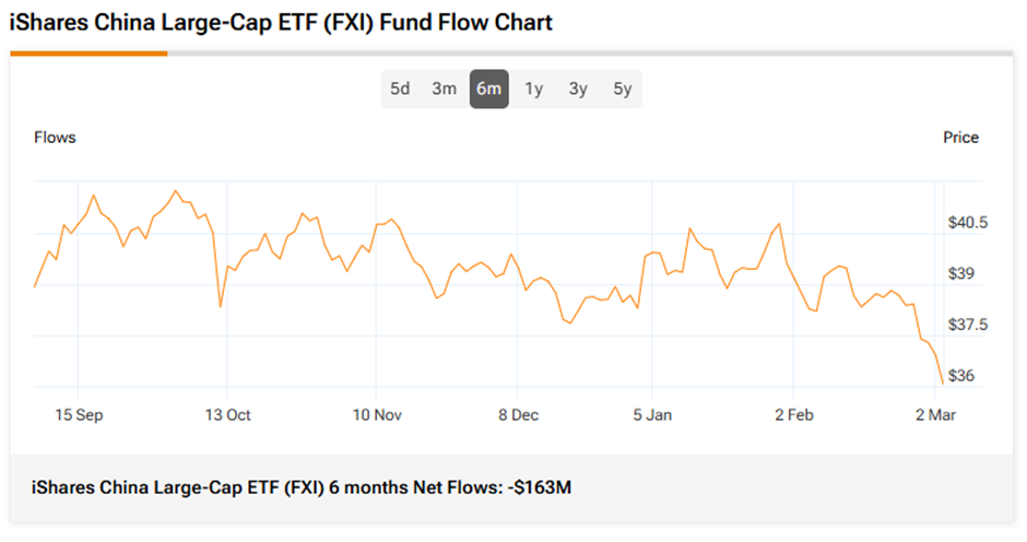 The iShares China Large-Cap ETF has seen the third-highest net outflows of $163 million over the past six months.
