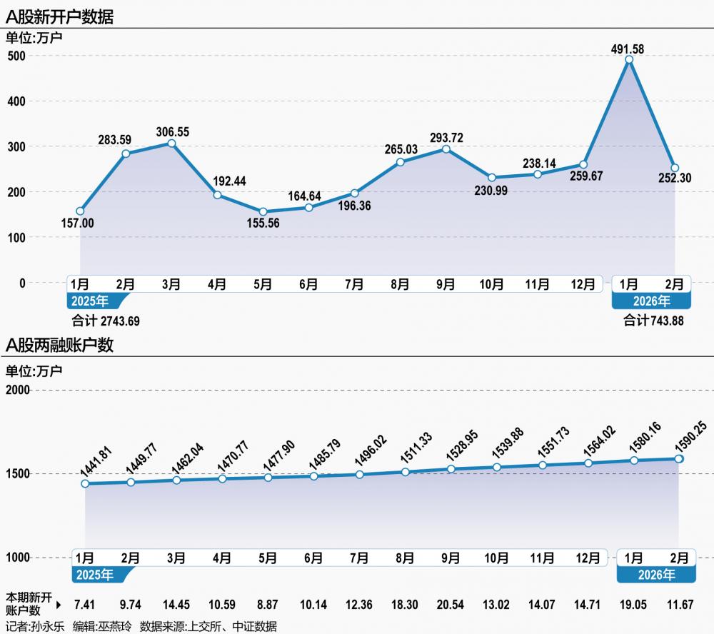 According to the latest data from the Shanghai Stock Exchange, the number of new A-share accounts opened in February reached 2.523 million, down 11% year-on-year from 2.8359 million in February 2025, and down 49% month-on-month from 4.9158 million in January this year.