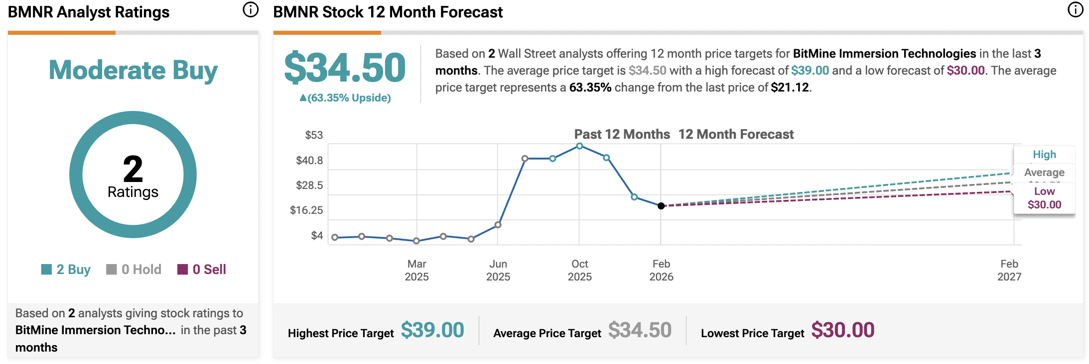 Turning to TipRanks, BMNR stock has a Moderate Buy consensus rating based on two Buy ratings from analysts assigned in the last three months. The average 12-month BMNR price target sits at $34.50, implying an upside potential of 63.35%.