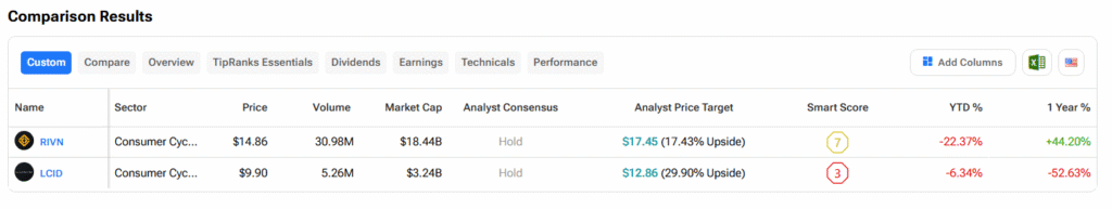Meanwhile, Rivian has a smaller expected upside of about 17%, based on its $17.45 price target. Still, Rivian’s higher Smart Score of 7 suggests stronger overall market momentum compared with Lucid.