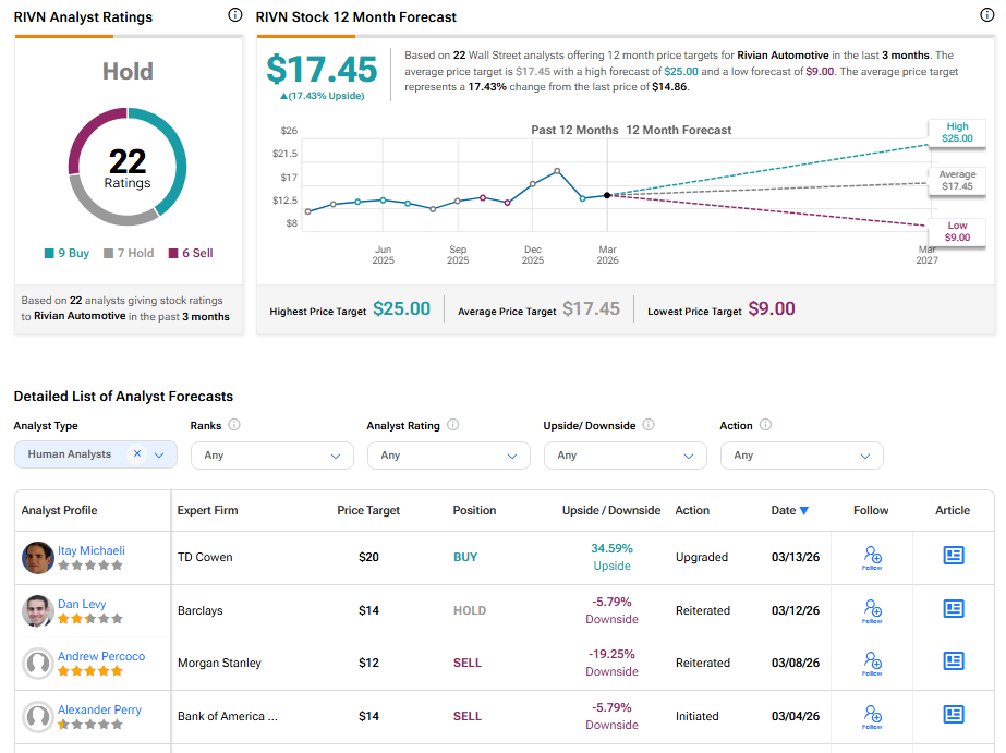 Following the announcement, TD Cowen analyst Itay Michaeli maintained a Buy rating on the stock with a price target of $20 per share. Overall, analysts have a Hold consensus rating on RIVN stock based on nine Buys, seven Holds, and six Sells assigned in the past three months. Further, the average RIVN price target of $17.45 per share implies 17.43% upside potential.