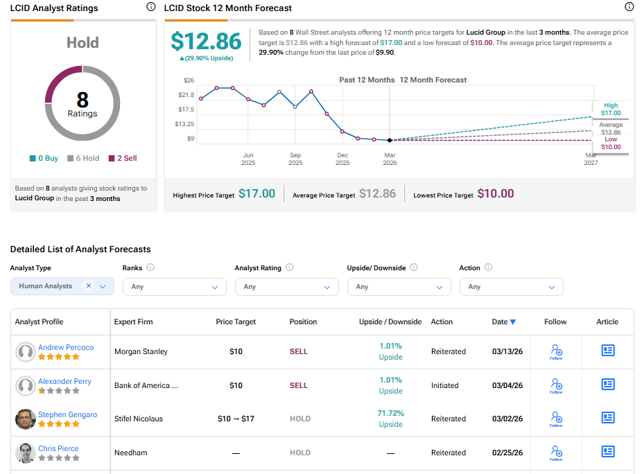 Turning to Wall Street, analysts have a Hold consensus rating on LCID stock based on zero Buys, six Holds, and two Sells assigned in the past three months, as indicated by the graphic below. Furthermore, the average LCID price target of $12.86 per share implies 29.9% upside potential.