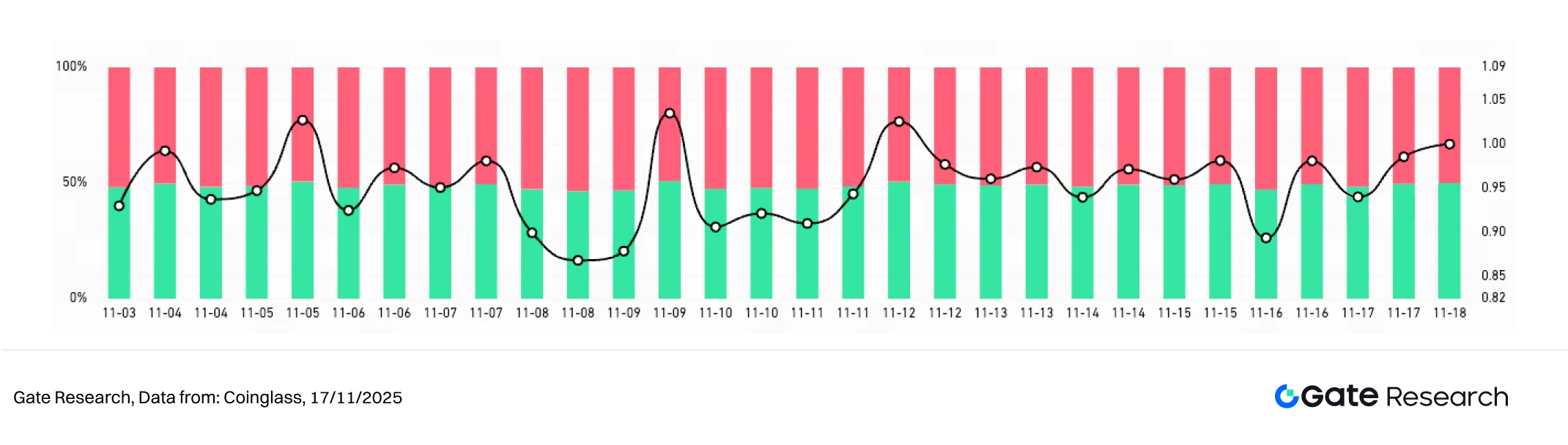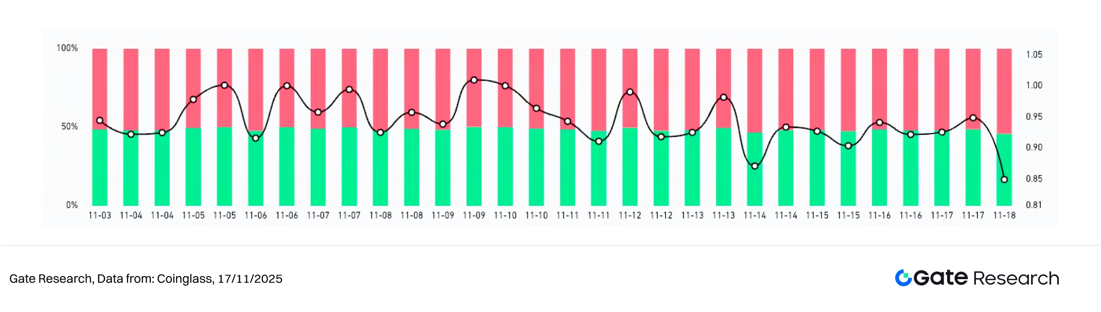 Segundo a Coinglass, entre 4 e 17 de novembro, o LSR de BTC e ETH oscilou estreitamente em torno de 1, refletindo uma disputa persistente num contexto de mercado fraco, sem formação de direção definida entre os operadores.【5】