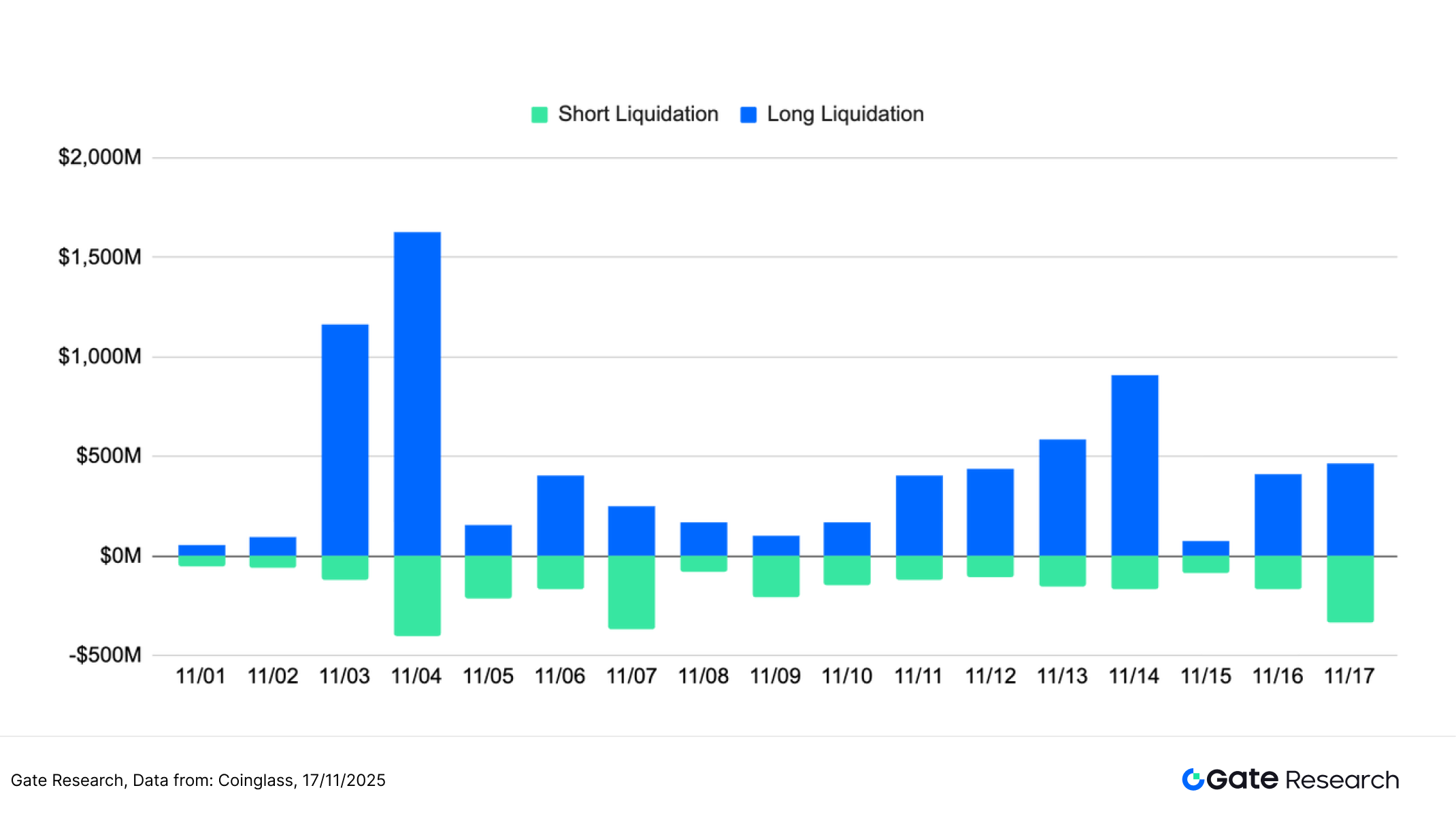 Segundo a Coinglass, as liquidações long em cripto nas últimas duas semanas foram significativamente superiores às short, mostrando que as posições long sob elevada alavancagem permanecem as mais pressionadas na atual correção. Nos dias 3 e 4 de novembro, registaram-se os maiores eventos de liquidação do mês, com liquidações long diárias na faixa dos 1,0–1,5 mil milhões USD, resultado da liquidação forçada após a quebra de suportes críticos.【9】