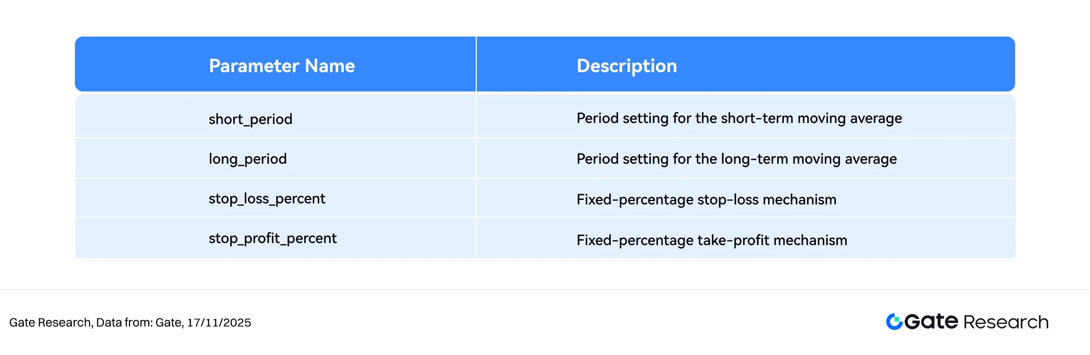 Quando o sistema deteta cruzamento da média móvel de curto prazo acima da de longo prazo, interpreta-se como início de tendência, acionando compra imediata. Esta estrutura visa captar a fase inicial de reforço da tendência, identificando mudanças por cruzamentos de médias móveis. Combinando regras dinâmicas de realização de lucro e stop-loss, a estratégia integra controlo de risco em ambos os extremos. Caso a média móvel de curto prazo cruze abaixo da de longo prazo ou o preço atinja limites predefinidos, o sistema encerra automaticamente a posição para consolidar lucros e mitigar risco.