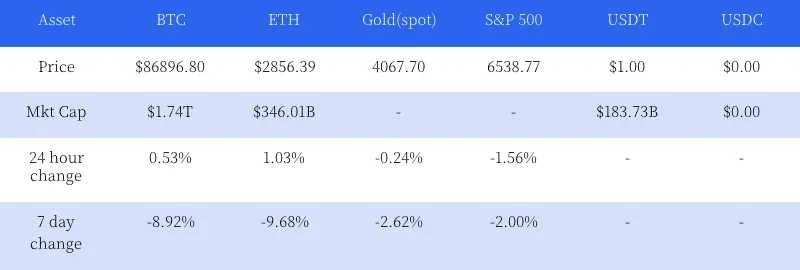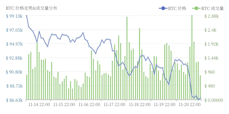 本周,数字货币总市值达到3.579万亿美元,环比下降7.9%。交易所交易量环比下降6.3%,达到1.2万亿美元。比特币价格下跌4%至87,415.51美元。市场情绪整体偏空,主导趋势为下跌。主要原因是美联储主席鲍威尔鹰派言论令市场避险情绪升温。
