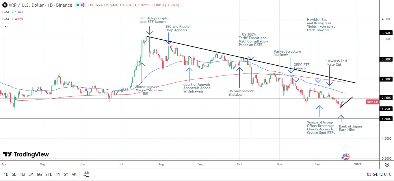 Ожидания снижения процентной ставки Федеральной резервной системой в марте продолжают расти, и опасения по поводу закрытия арбитражных сделок с японской иеной несколько ослабли, что вместе поддерживает краткосрочные и среднесрочные перспективы для XRP. Более важным катализатором является продвижение Закона о рыночной структуре на Капитолийском холме. Несмотря на то, что приостановка работы правительства США замедлила продвижение законопроекта, законодатели все еще надеются на обсуждение в начале января. Смогут ли Закон о рыночной структуре принять в первом квартале, вероятно, станет ключевым катализатором, влияющим на ценовые тренды.