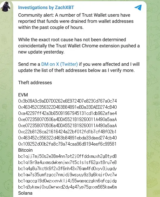 ZachXBT заявил, что за последние несколько часов несколько пользователей Trust Wallet сообщили о несанкционированных выводах средств с их кошельков. Он отметил, что точная причина пока не подтверждена.