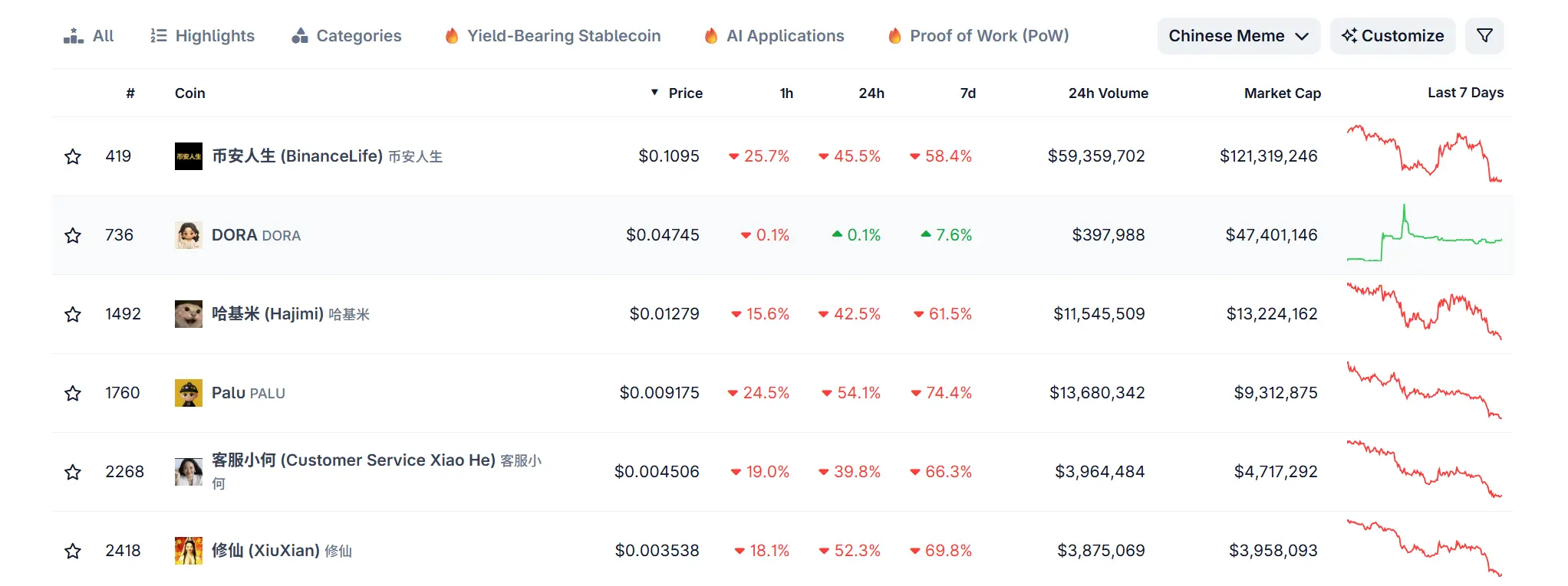 截至11月4日,中文Meme全线溃败:PALU一周跌70%,哈基米跌61%,客服小何跌66%,修仙跌69%。生命周期从周缩短至天,市值门槛从亿级降至百万级,大部分项目存活不到48小时。