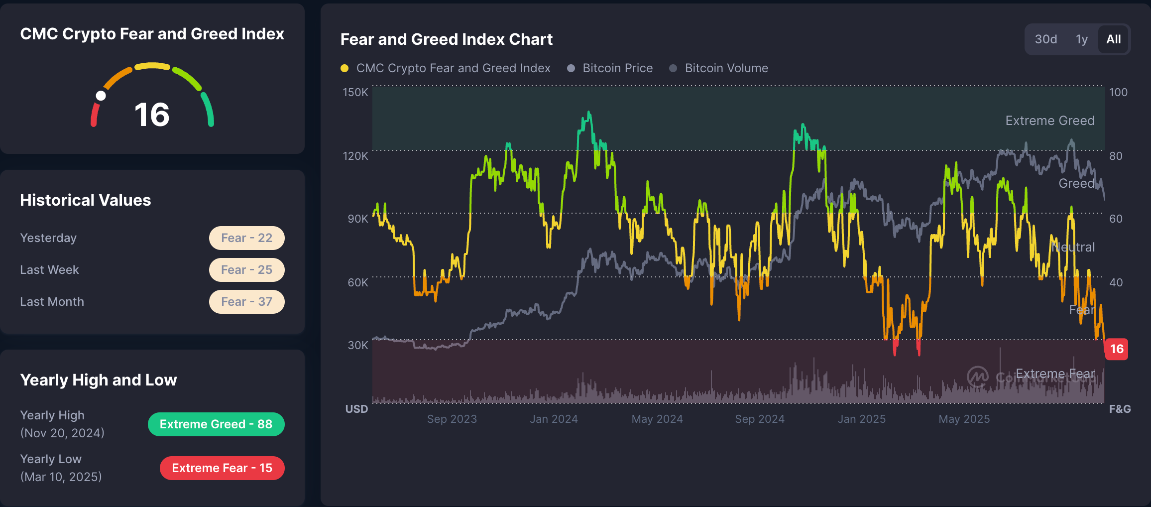 Korku ve Açgözlülük Endeksi 16'ya düştü, kripto para yatırımcıları arasında “aşırı korku” sinyali veriyor | Kaynak: CoinMarketCapPiyasa analisti ve CoinBureau'un kurucusu Nuc Puckrin, bu döngüdeki %25'lik düşüşün en düşük düzeltme seviyesi olduğunu belirtti (, önceki %30'un üzerindeki düşüşlerle karşılaştırıldığında), yatırımcı psikolojisinin hala “yıkıldığını” ifade etti.