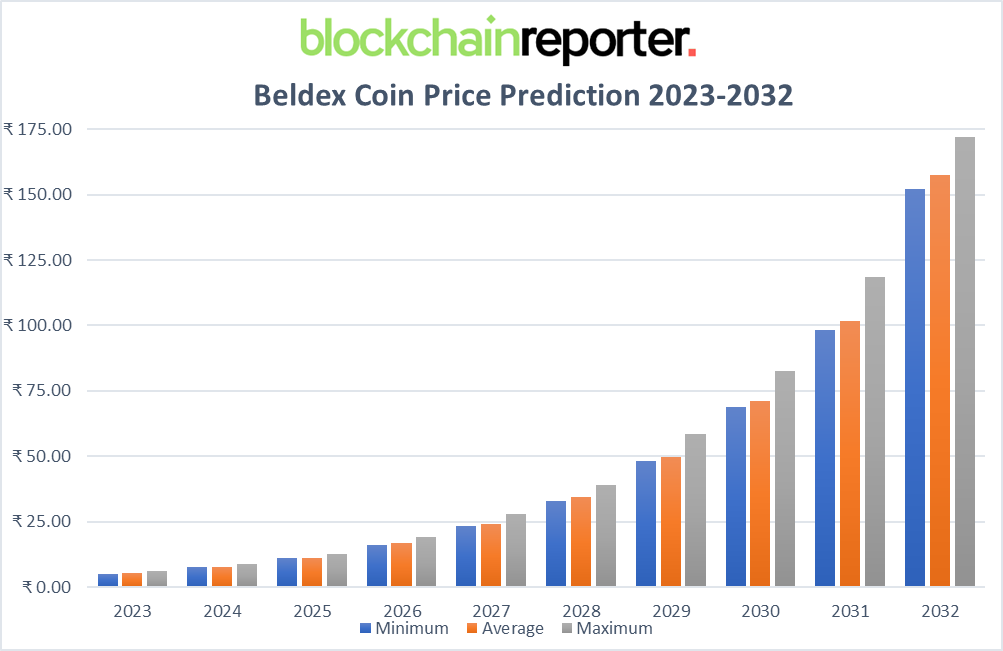 According to Digital Coin Price, industry experts forecast a slow increase in the price of Beldex Coin in the coming years, with a potential range of ₹9.60 to ₹83.20 by 2032.