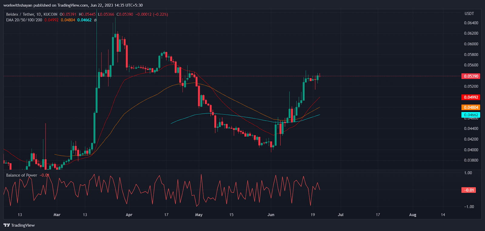 According to Coinmarketcap, Beldex coins are currently trading at $0.053, reflecting an increase of over 0.25% in the last 24 hours. Our technical uation of Beldex coins indicates that the bearish sentiment has not faded yet, and bears may make a comeback with their domination if the Beldex coin fails to hold bullish goals. Examining the daily price chart, the Beldex coin has found support near the $0.052 level after witnessing a massive surge in the last few weeks. As Beldex’s price recently broke above multiple EMA lines, it strengthens long-position holders’ confidence to make further surges. However, a breakdown from the current level will result in a steep collapse, and buyers may lose confidence and exit long positions, pushing the coin’s price lower in the coming days. The Balance of Power (BoP) indicator is currently trading in a minor bullish zone at 0.01, hinting at a slight rejection above $0.055