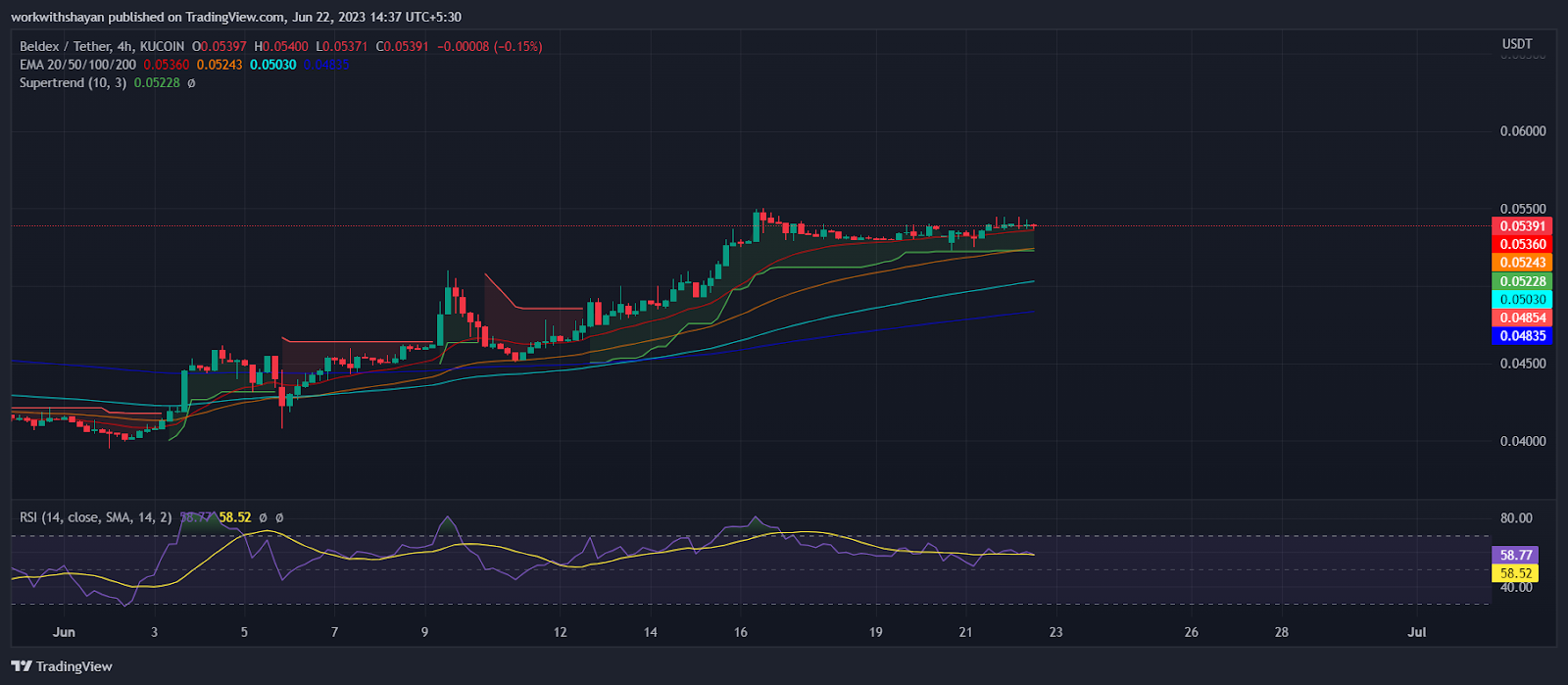 To thoroughly analyze the price of Beldex coin, it is crucial to take into account the RSI-14 indicator. As this indicator recently experienced substantial buying pressure, it has surged above the midline and continues to trade near the 58 level, suggesting an intensity between bears and bulls after the Beldex coin reached a crucial level of $0.05. It is anticipated that Beldex’s price will soon attempt to break above its 38.6% Fibonacci level to achieve its short-term bullish goals. If Beldex fails to climb above this Fibonacci region, a downtrend might be imminent.