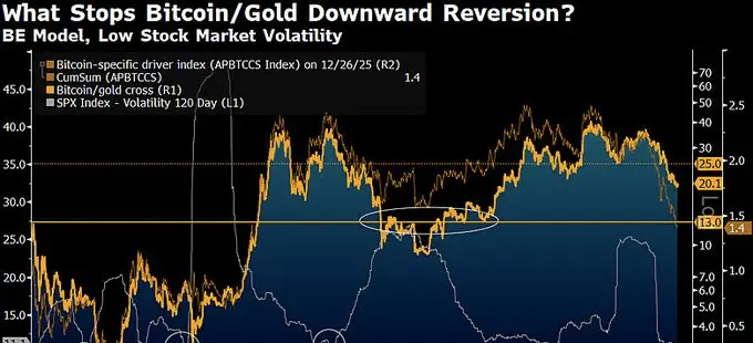 A second chart focuses on the relationship between Bitcoin and Gold, examining the Bitcoin-to-gold ratio alongside stock market volatility and a proprietary valuation framework. Titled “What Stops Bitcoin/Gold Downward Reversion? BE Model, Low Stock Market Volatility,” the chart places the ratio near 20x as of Dec. 29, with a modeled trajectory toward 13x based on inputs from Bloomberg Economics.