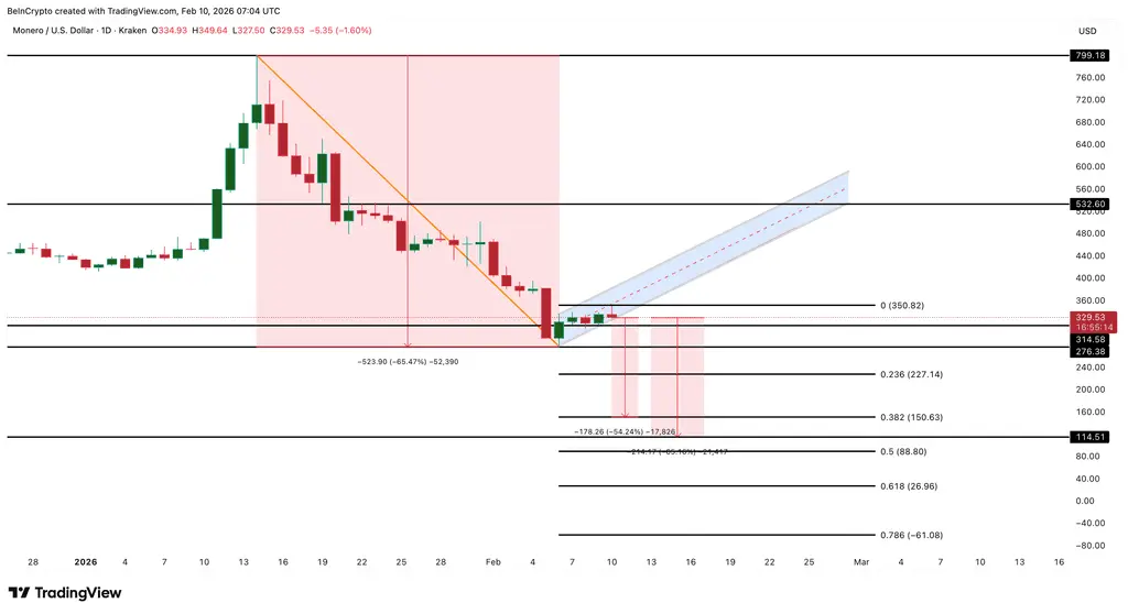 Fibonacci retracement analysis points to the next major demand zone near $150. A drop from current levels to $150 would represent over 50% additional decline, comparable to the first phase of Monero’s current downtrend.