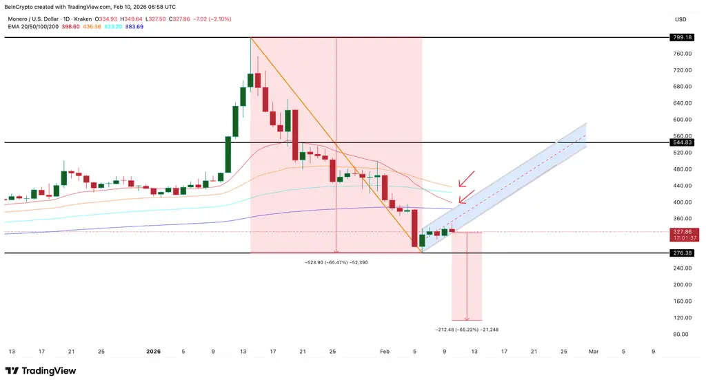 Technical charts tell the story of Monero’s ongoing bear market. The daily chart clearly shows a typical bear flag pattern forming—characterized by a sharp decline followed by a narrow consolidation. The flagpole is formed by the steep drop from $799 to $276, while recent consolidation around $330 creates the flag’s surface.