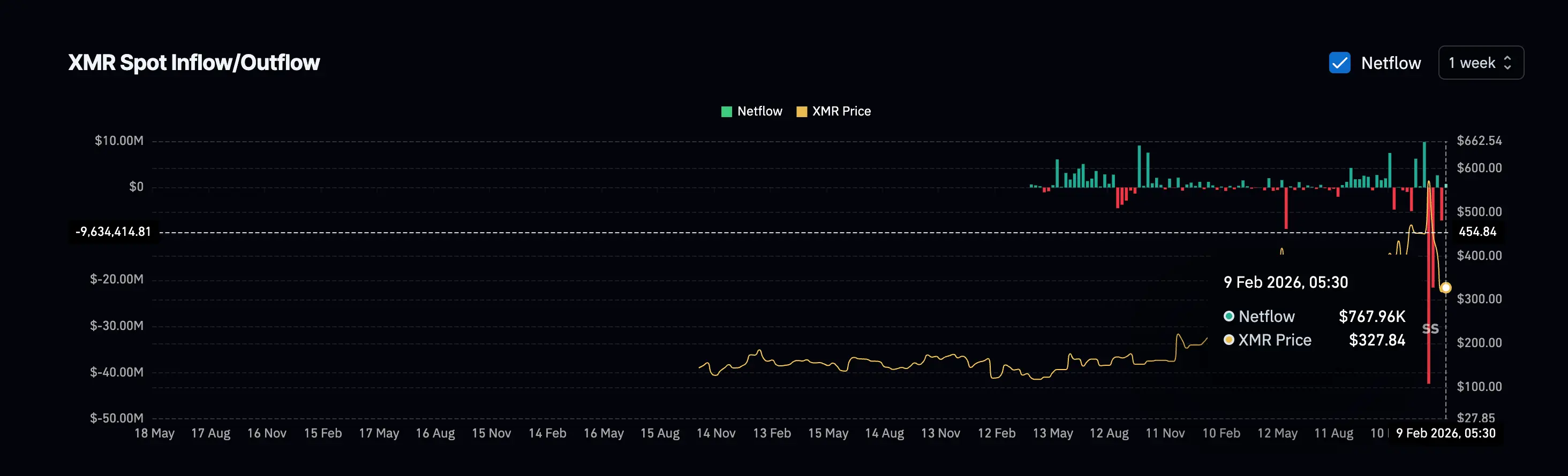 By the week ending February 9, the flow reversed significantly, with net inflows reaching about $768,000. This suggests more XMR is flowing back into exchanges from wallets, indicating investors are reducing their positions during the rebound.