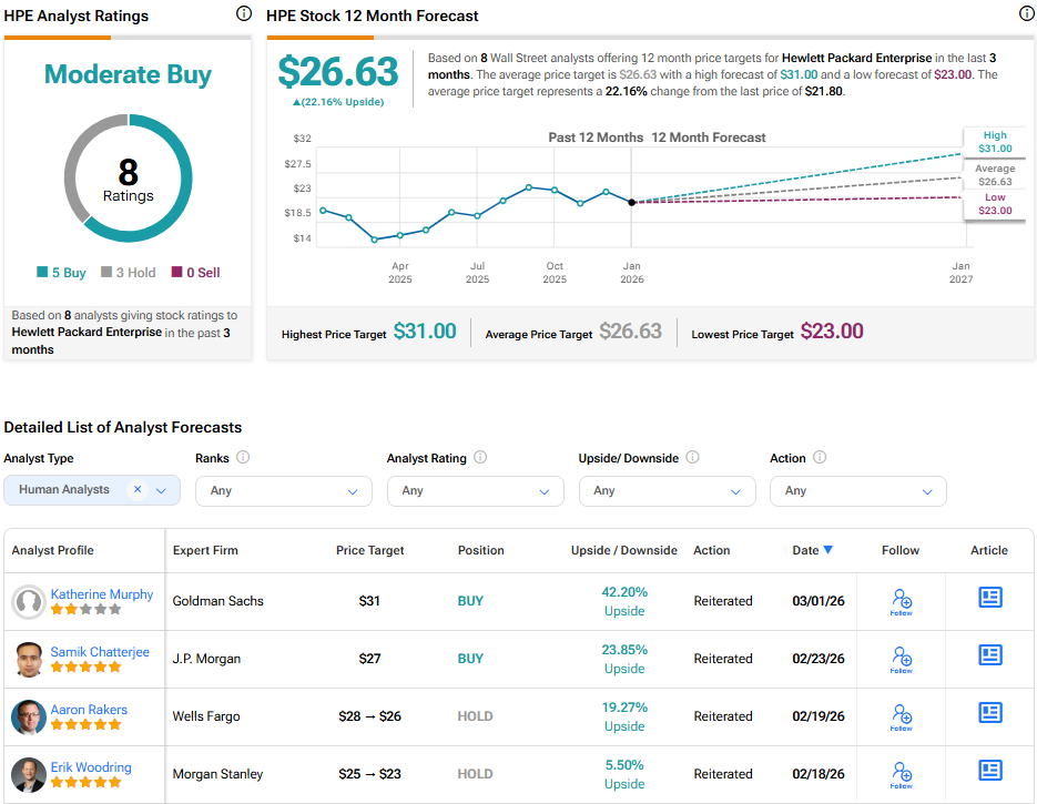 Turning to Wall Street, analysts have a Moderate Buy consensus rating on HPE stock based on five Buys, three Holds, and zero Sells assigned in the past three months, as indicated by the graphic below. Furthermore, the average HPE price target of $26.63 per share implies 22.2% upside potential. However, it’s worth noting that estimates will likely change following today’s earnings report.