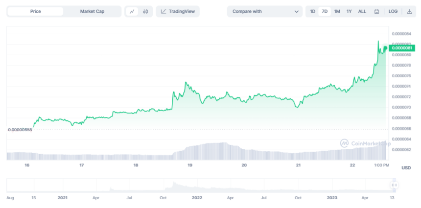 The current trading price of DOGE on CoinGecko is $0.00000812, showcasing a decent 9.5% surge within the past 24 hours. Additionally, over the span of the previous seven days, DOGE has witnessed an impressive gain of 23.1%.