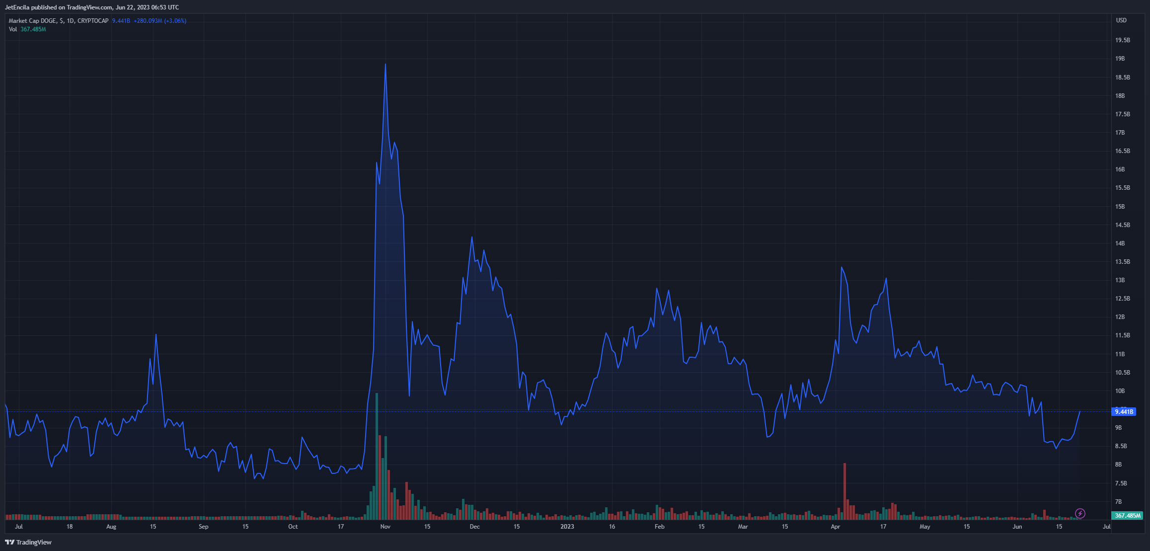 DOGE market cap currently at $9.4 billion. Chart: TradingView.com