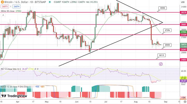 Despite market fluctuations, the technical aspect of Bitcoin remained steady on Sunday. The initial price of the widely used digital currency, Bitcoin, is consolidating in a narrow trading range of $25,500 to $27,000.