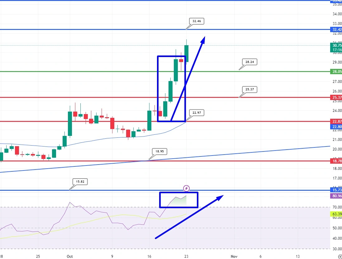 On a 4-hour chart timeframe, certain critical price levels are noteworthy. The pivot point for Solana is delineated at $28.24. As we trace the upward trajectory, an immediate resistance lies at $32.46, succeeded by subsequent resistance levels at $35.62 and $38.87