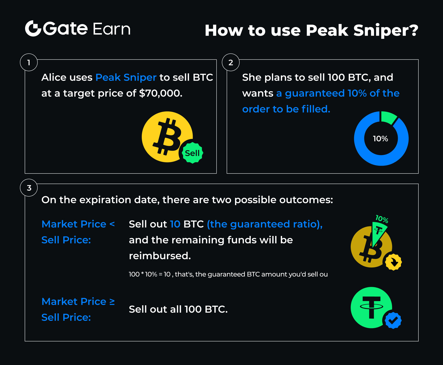 Незалежно від коливань цін, Пік снайпер може допомогти вам продати принаймні певний відсоток монет за бажаною ціною, не турбуючись про тенденцію до зниження.
