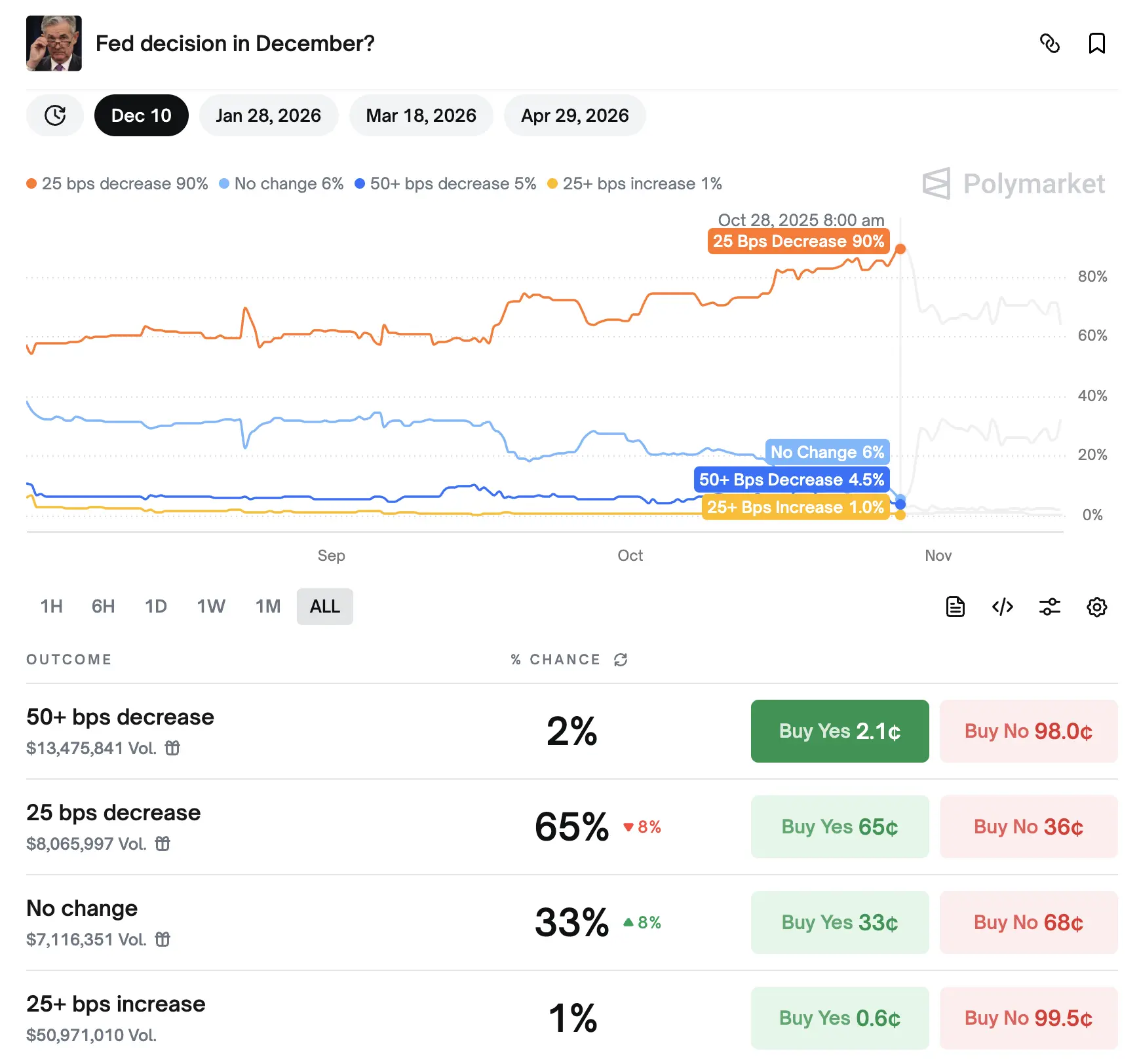 Спочатку ймовірність зниження процентної ставки на засіданні Федеральної резервної системи 10 грудня становила 90%, наразі на Polymarket вона знизилася до 65% (на момент публікації – 51%).