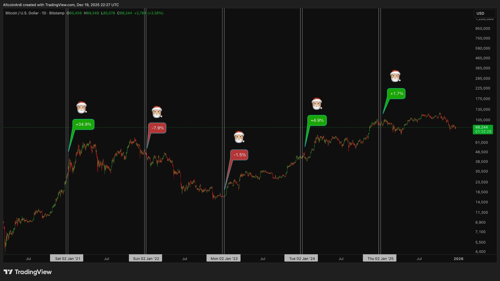 BTC/USD 在聖誕假期的價格表現。來源:Ardi