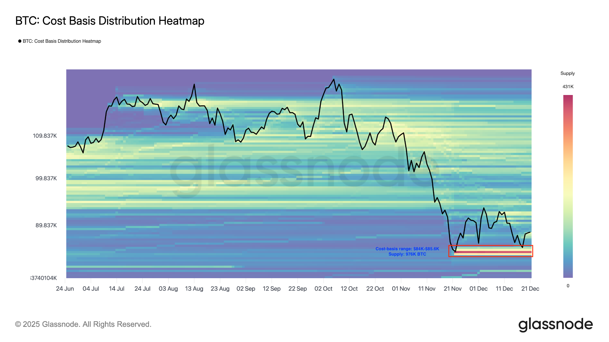 Glassode的成本基礎分布熱圖強化了這一水平的重要性。立即支撐位在$84,000-$85,600,投資者在此處獲取了大約976,000 BTC。