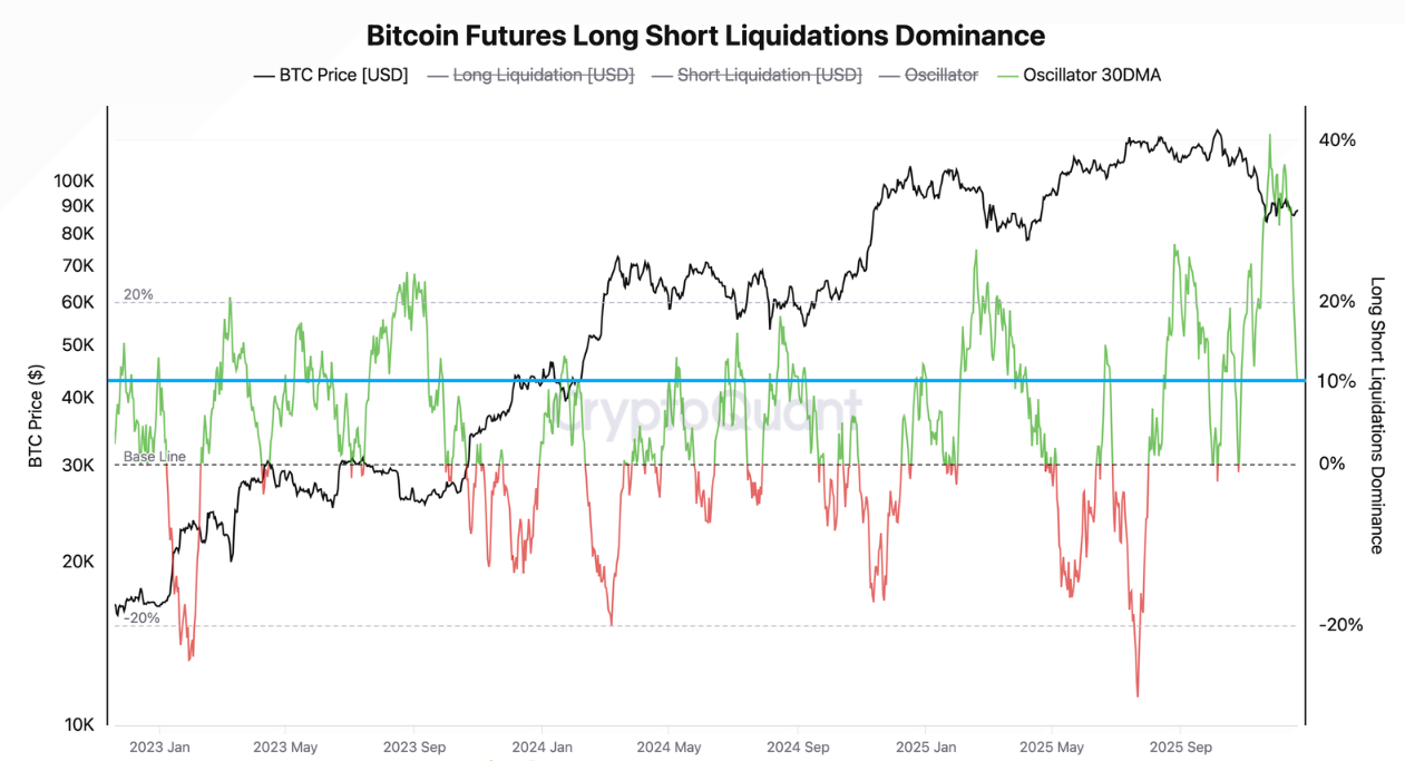比特幣期貨多頭空頭清算佔比。來源:CryptoQuant