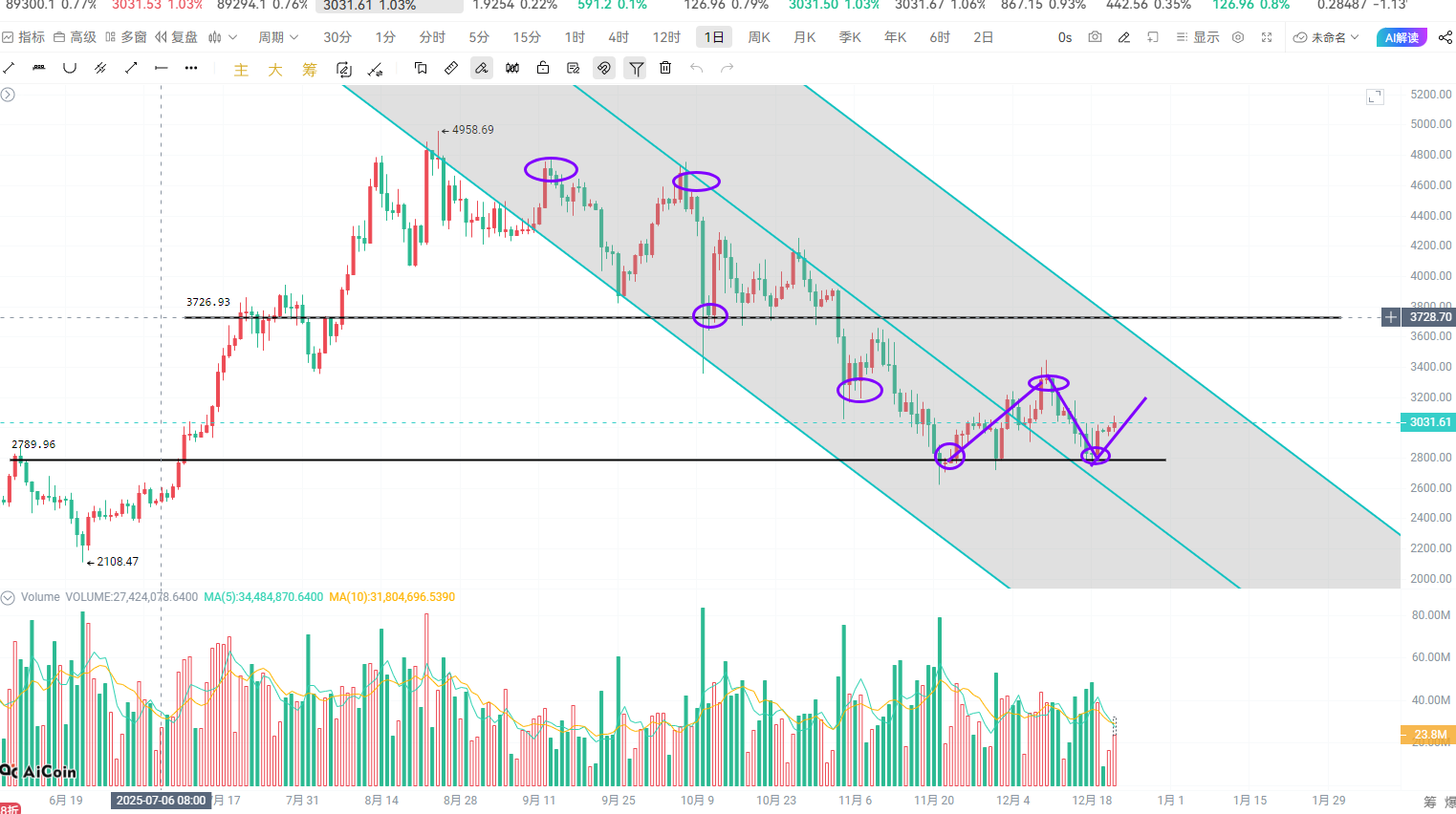 ETH:二餅現在是被大餅完全帶着節奏走,日線級別的下跌通道雖然短期出現多頭的反彈,但是上方3070一線就像是一道越不過的坎,下方現在2780量能不足導致反攻沒有持續性,近期的黃金和大A更是把市場的流動馬內抽走了,所以市場最近呈現出一潭死水。