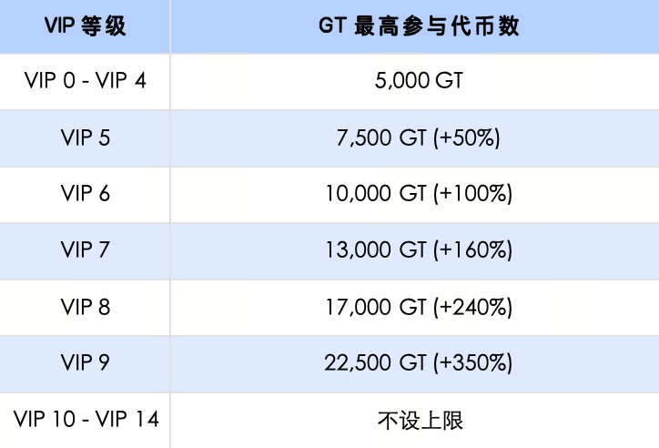 完成身份认证;GT 持仓 ≥ 1 GT,可按照 GT 持仓快照量占比瓜分总奖池。每位 VIP 0 - VIP 4 用户本次活动参与上限为 5,000 GT,VIP 10 及以上用户最高可享【不设上限】的参与额度。