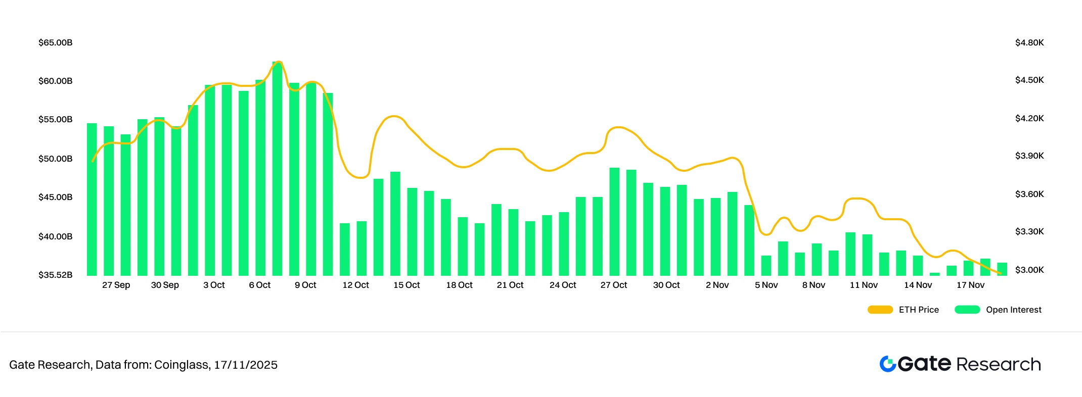 BTC 的持仓金额自 10 月初高点快速下滑后,一直在相对低位区间徘徊,未出现显著加仓迹象,反映多头在弱势行情下保持谨慎,机构与主力资金观望情绪浓厚。ETH 的 OI 同样呈现阶梯式下滑格局,在 11 月初出现明显的持仓断层,随后维持在低档水平小幅波动。相比 BTC,ETH 的持仓回补并未更强,显示资金对中期走势仍趋保守。